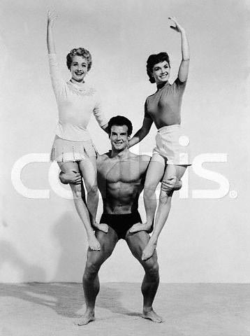 Original caption: The young man of might with his arms full of Jane Powell and Debbie Reynolds (right) is Steve Reeves, better known as “Mr. America of 1947”; “Mr. World of 1949” and “Mr. Universe of 1950.” He will appear with the two beauties in a forthcoming film. July 7, 1954 Los Angeles, California, USA